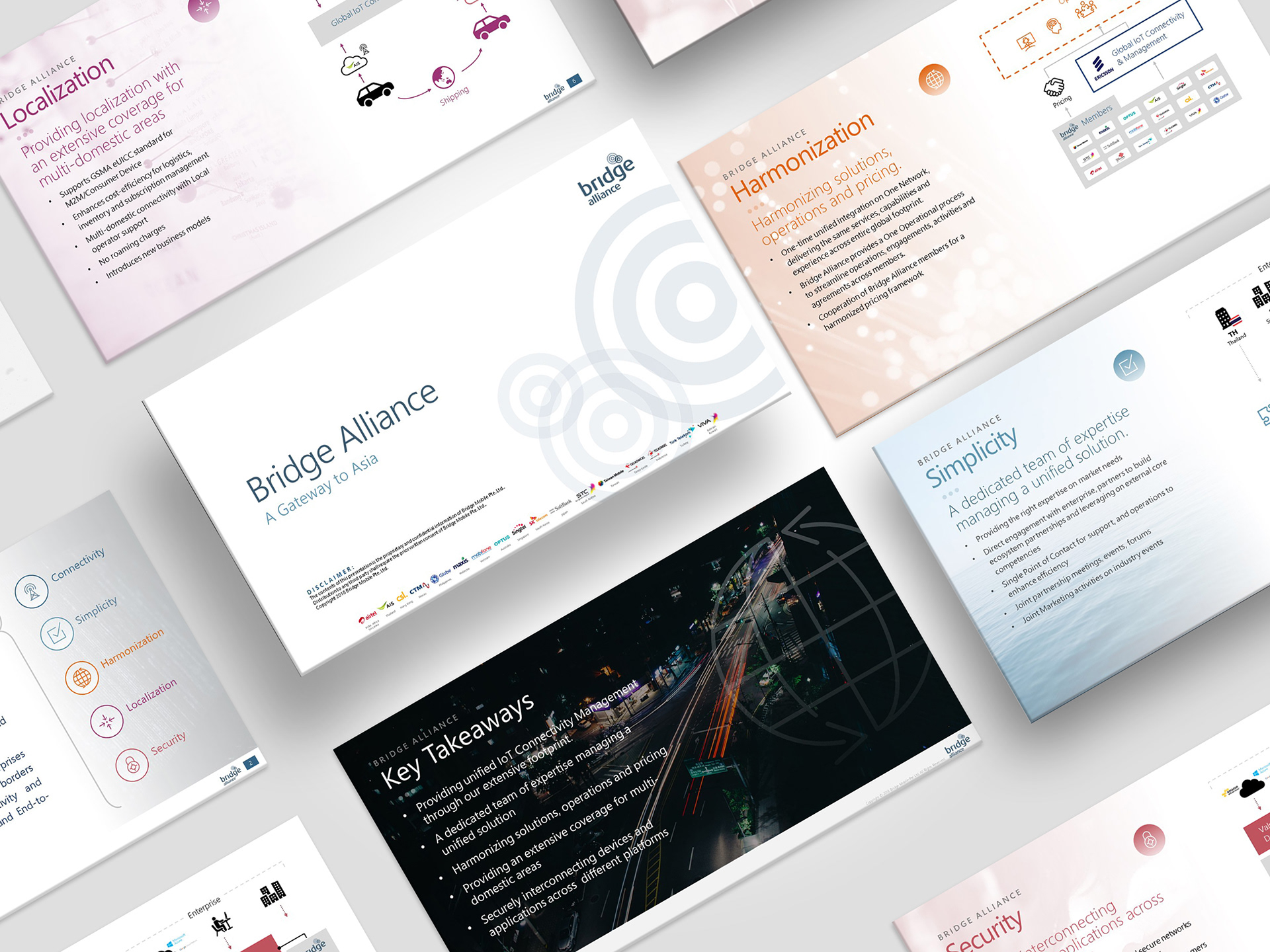 Bridge Alliance (bridgealliance.com) is an alliance of 34 premier mobile telecommunications companies in Asia, Australia, Africa and the Middle East. Designed a sales deck and two-page brochure, re-envisioning several key infographics & process flow diagrams that describe the advantages of Bridge Alliance's seamless service connectivity and a suite of integrated value-added services.