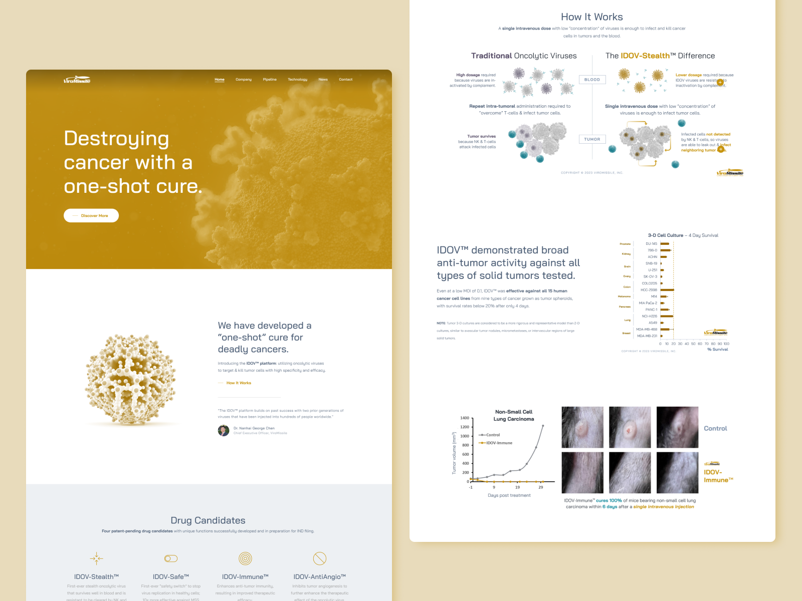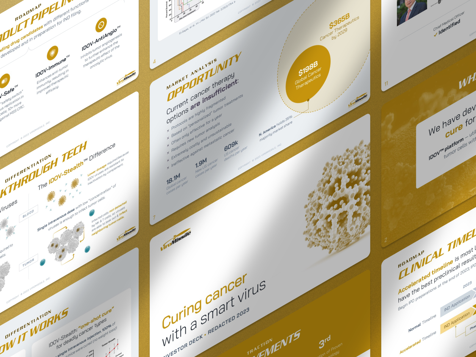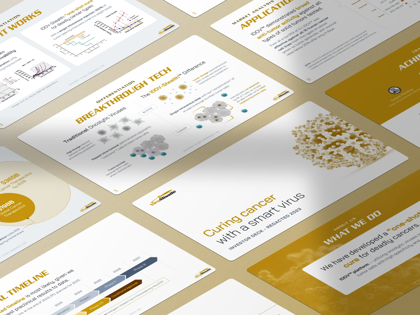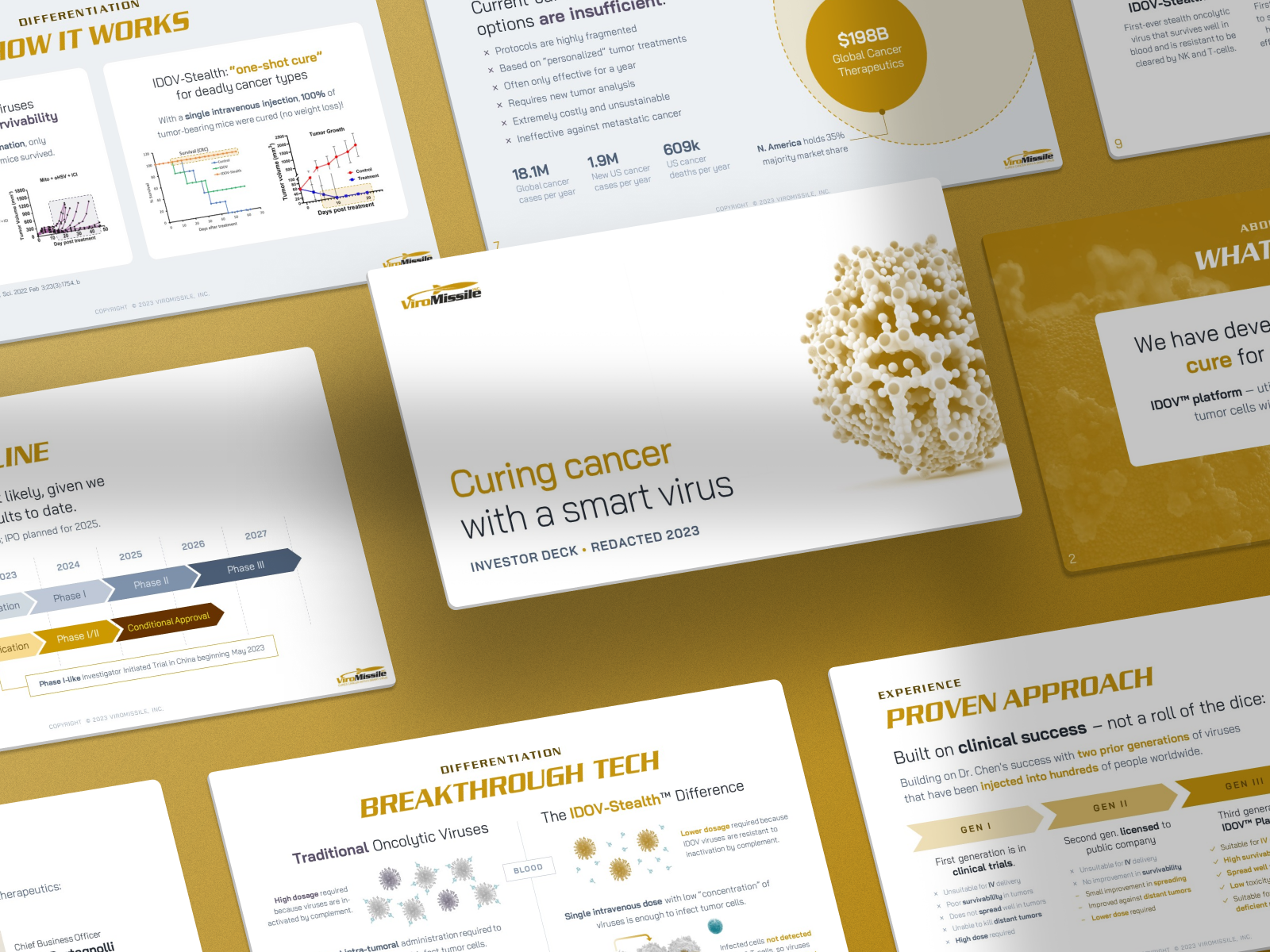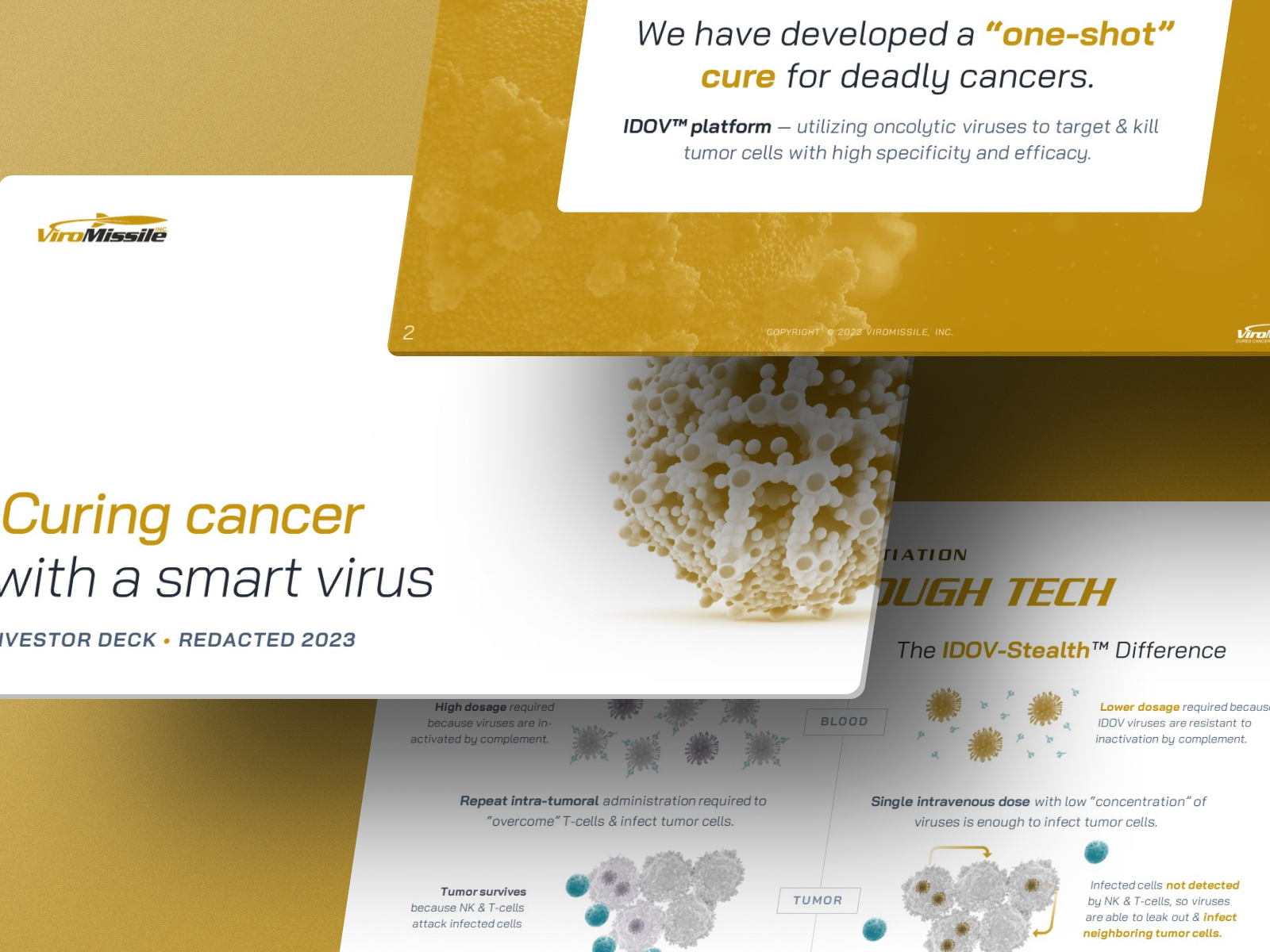 I had the privilege of working with ViroMissile to create the cutting-edge cancer tech company's website (live at viromissile.com) and Series A investor pitch deck.