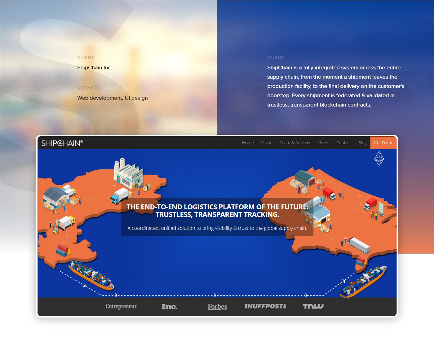 ShipChain is a fully-integrated, track-and-trace, Ethereum-based system across the entire supply chain for logistics & shipping. Developed their new landing page and website.