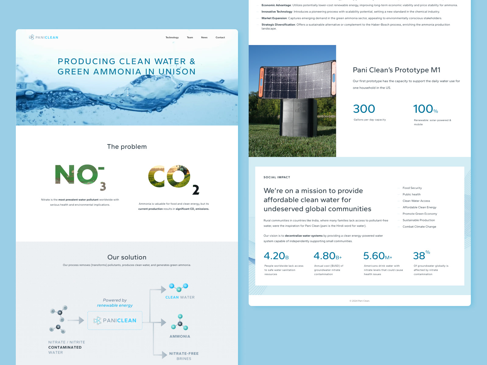 Pani Clean is pioneering green and energy-efficient water treatment solutions to provide clean water access. Their proprietary process (powered by renewable energy) removes pollutants, produces clean water, and generates green ammonia.